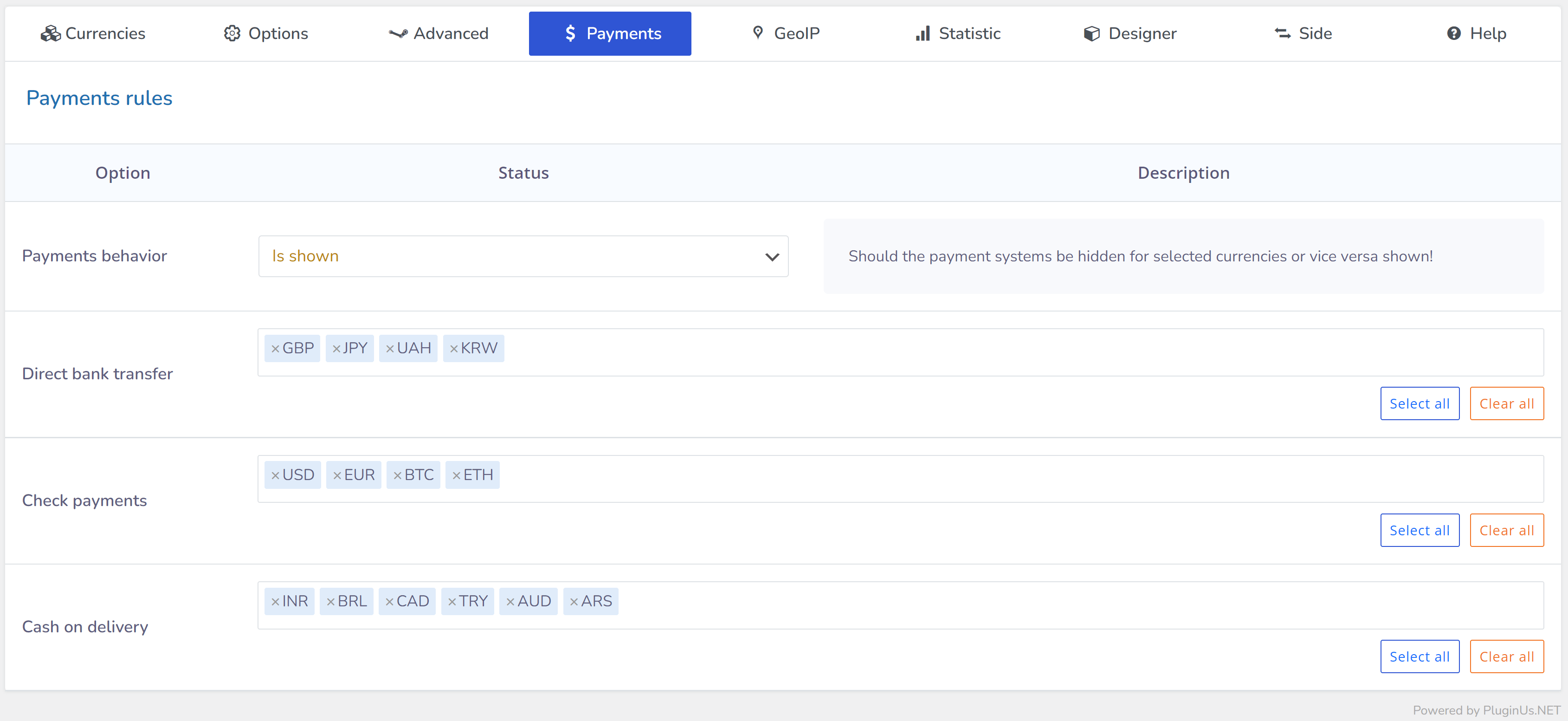 [ Ödeme kurallarını yönetme ] – Bu özellik sayesinde, mağaza yöneticisi WooCommerce mağazasında bulunan her para birimi için belirli ödeme yöntemlerini yapılandırabilir ve atayabilir. Bu, farklı para birimlerinde ödeme yapan müşterilere, kendi para birimlerine en uygun ve alakalı özel ödeme seçeneklerinin sunulabileceği anlamına gelir.